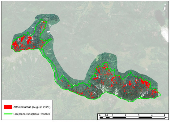 Ips typographus spots in the Chuprene Reserve in 2020 (satellite images).