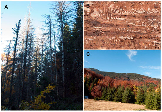Damage caused by Ips typographus in the Chuprene Reserve: (A)—dead spruce trees; (B)—pest galleries under the bark; (C)—migratory bark beetle spots.