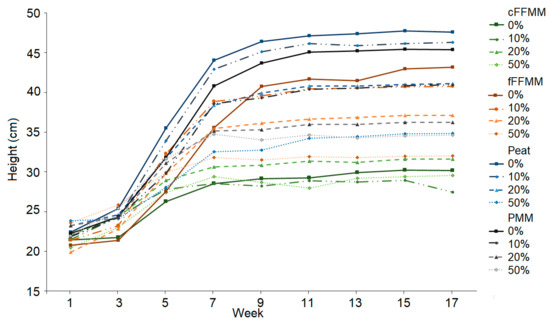 Height (cm) over time for each soil type and 0%, 10%, 20% and 50% wood amount. Values are averages. cFFMM, coarse forest floor-mineral mix (green); fFFMM, fine forest floor-mineral mix (orange); PMM, peat-mineral mix (grey); peat (blue).
