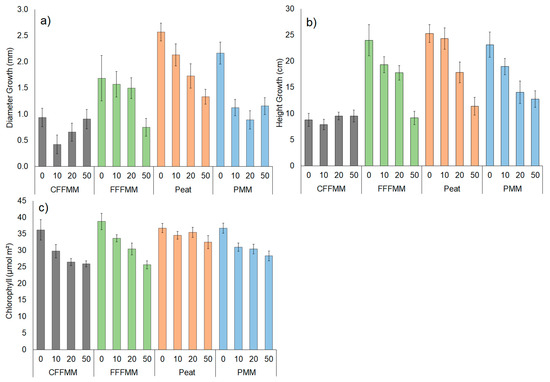 (a) Diameter growth (mm), (b) height growth (cm), (c) foliar chlorophyll concentration (µmol m2), for each soil type and 0%, 10%, 20% and 50% wood amount. Values are averages with standard error. cFFMM (grey), coarse forest floor-mineral mix; fFFMM (green), fine forest floor-mineral mix; peat (orange); and PMM (blue), peat-mineral mix.