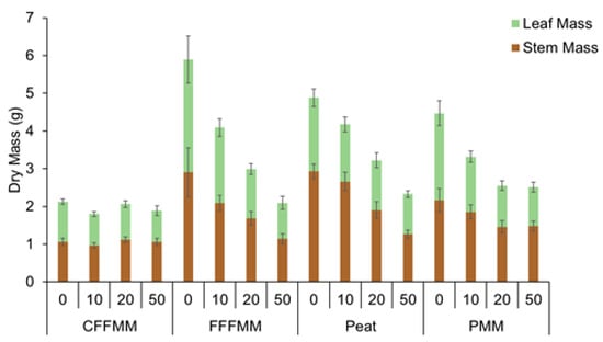 Dry leaf (green) and stem (brown) mass (g) for each soil type and 0%, 10%, 20% and 50% wood amount. Values are averages with standard error. cFFMM, coarse forest floor-mineral mix; fFFMM, fine forest floor-mineral mix; PMM, peat-mineral mix.