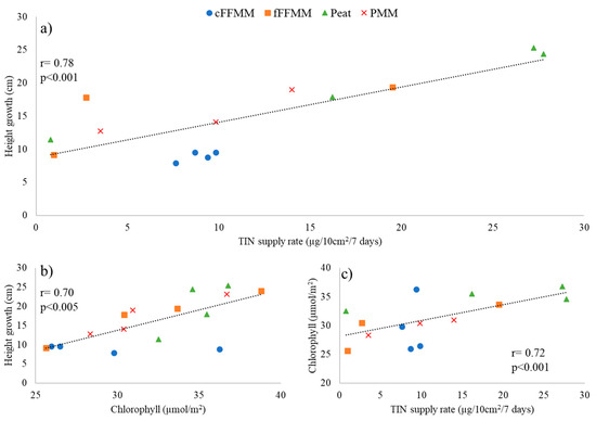 Scatter plots between height growth and total inorganic nitrogen (TIN) supply rates (a) (r = 0.77, p < 0.001), height growth and chlorophyll concentration (b) (r = 0.70, p = 0.004), and chlorophyll concentration and TIN supply rates (c) (r = 0.72, p < 0.001) among the different soil types. cFFMM (blue dot), fFFMM (orange square), peat (green triangle) and PMM (red cross). Each data point represents an average of each treatment.