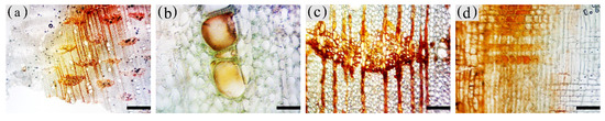 The fungal hyphae in the xylem of A. sinensis were branched. The main hyphae were 3–4 μm wide, and the branched hyphae were approximately 1.5 μm wide. Both had a smooth surface (Figure 13a) and spread axially (Figure 13b) [27]. The propagules were dark brown and ellipsoidal, with a long axis of 3–4 μm and a short axis of 1–3 μm (Figure 13c).