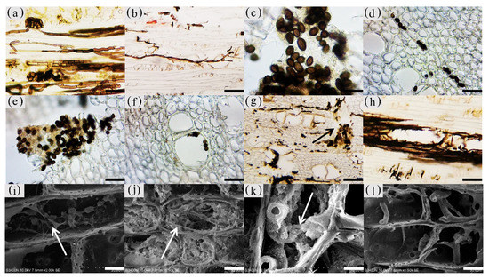 No fungal propagules or mycelia were observed in the blank control and the white zone. Very few branched mycelia were present in the wood rays of the transitional zone (Figure 13i). An insignificant number of fungal propagules or mycelia were distributed in parenchyma cells such as xylem rays (Figure 13j) in the agarwood zone. However, a considerable number of inclusions were attached to the surface of the mycelium (Figure 13k). In the decay zone, a considerable number of oval fungal propagules were observed in the axial parenchyma, xylem rays (Figure 13d), interxylary phloem (Figure 13e), and vessels (Figure 13f). The mycelia of the decay zone were widely distributed in all tissues. Mycelia were present in xylem rays (Figure 13l), axial parenchyma, interxylary phloem, and fibers (Figure 13m,n). The interior of the interxylary phloem in the decay zone contained a significant amount of fungi, and there was no longer an intact cell form (as in Figure 13g). The vessels were filled with mycelia (Figure 13h), and the branched hyphae expanded into adjacent cells through the grains in the cell wall (Figure 13o arrow). Mycelial fusion occurred at the point of contact between the branching mycelium and the main mycelium (as shown in Figure 13p arrow), forming a mycelial network in the xylem [28]. There was no significant difference in the distribution of 12 and 18 months of inoculation in A. sinensis.