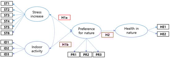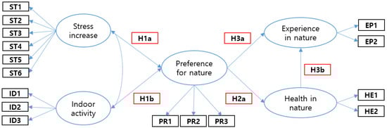 The final exogenous variables were composed of six increased-stress items and three indoor-activity items. The final endogenous variables also included two health-in-nature items and three preference-for-nature items.