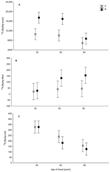 Activity of 40K in wood (A), litter (B), and soil (C) in pine (P) and birch (B) stands of different ages (mean ± confidence level).