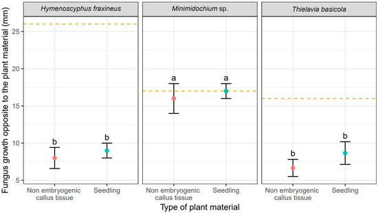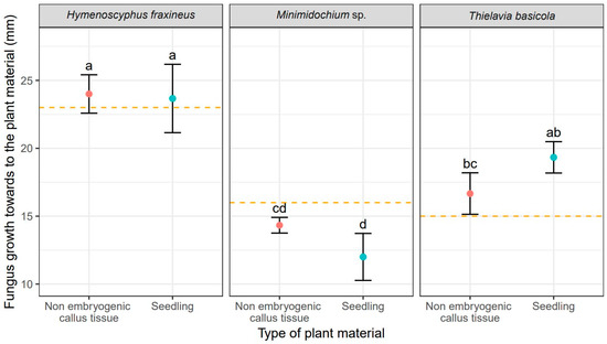 Mean values (points) and standard deviations (error bars) for fungus size in the direction towards to the plant material (red—non embryogenic callus tissue, light blue—seedling). The orange dashed lines show fungus size in the experiments without plant material. The same letters indicate the lack of statistically significant differences (p < 0.05).
