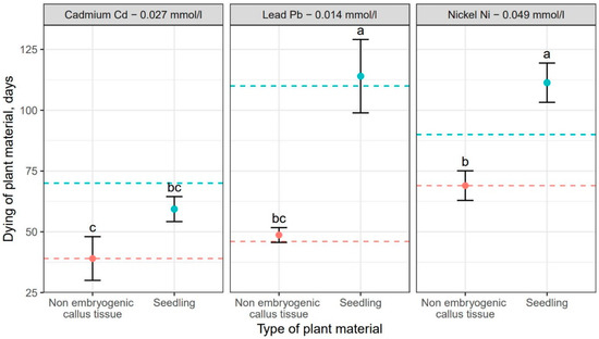 Mean values (points) and standard deviations (error bars) for dieback of plant material (red—non embryogenic callus tissue, light blue—seedlings) under the influence of selected heavy metals. The dashed lines show the development of plant material (red—non embryogenic callus tissue, light blue—seedlings) in experiments without the heavy metals. The same letters indicate the lack of statistically significant differences (p < 0.05).