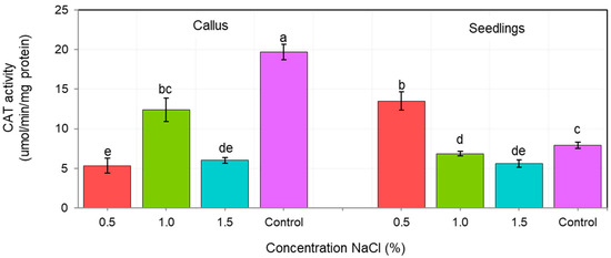 Changes in catalase activity (CAT) in callus and seedlings of F. excelsior L. Other letters—there are statistically significant differences.