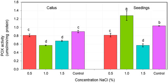 Changes in nonspecific peroxidase (POX) activity in of F. excelsior callus and seedlings. Other letters—there are statistically significant differences.
