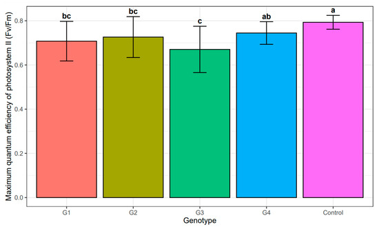 Mean value and standard deviation of maximum quantum efficiency of photosystem II (Fv/Fm) of individual genotypes: G1–G4 under the influence of salinity and control. The same letters indicate lack of statistically significant differences (p < 0.05).