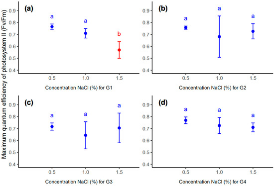 Mean value (point) and standard deviation (error bar) for genotype: G1 (a), G2 (b), G3 (c) and G4 (d) in different concentrations of NaCl: 0.5, 1.0, 1.5 (%). The same letters inside each subplot indicate the lack of statistically significant differences between means (p < 0.05).