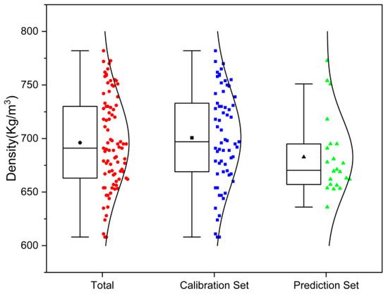 The boxplot of the measured density values is shown in Figure 2. The range of the entire data set was from 608 to 782 Kg/m3 and the average density content was 696 Kg/m3. The range of the calibration data set was larger than the prediction data set to ensure no extrapolation. The distributions of the density values of the prediction set were well within the calibration set. The standard deviation (SD) indicates the dispersion degree of the sample set. It can be found that the SD and average values of the calibration and prediction sets were similar, which indicated that the data set was representative.
