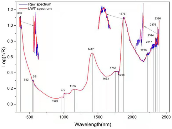 It can be seen in Figure 3 that, for raw spectrum and LWT spectrum, the trends and absorption peaks are the same except for the edges of the spectrum, which indicated that the useful information related wood properties were maintained after the spectrum was processed by LWT. Two significant absorption peaks were found around 1417 nm and 1633 nm, and they were related to the first overtone of C-H stretching vibration of lignin and the O-H stretching of cellulose, respectively [28,29]. Combined with the results of the PLS model, it was demonstrated that LWT had improved the model accuracy. Hence, the spectra processed with the LWT method were used for further analysis.