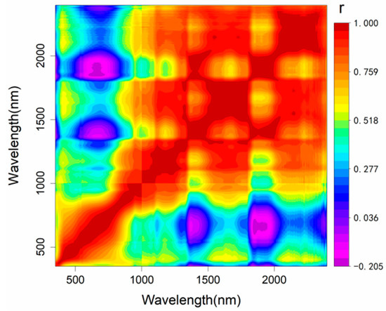 Two-dimensional (2D) correlation spectroscopy was adopted to analyze the correlation between Vis-NIR spectral variables from 350 to 2397 nm. A high correlation coefficient (r) value indicated that spectra exist with more collinearity and redundant information. The 2-D correlation spectra of wavelength variables are shown in Figure 4.