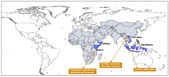 Second, the study involved case studies undertaken in northwest Vietnam, northeast Kenya–south Somalia border, and Cidanau Watershed in the western part of Indonesia (Figure 1). The authors were directly involved in various phases of the case studies. The case studies were chosen as part of the authors’ study on “governance of shared landscapes” under the global research program: Policies, Institutions, and Markets (PIM) of the Consultative Group on International Agricultural Research (CGIAR), coordinated by the International Food Policy Research Institute (IFPRI). The three case studies illustrate different scales and diversity of issues addressed through polycentric governance (Table 3). Table 3 shows the key characteristics of each study site with details described further below.