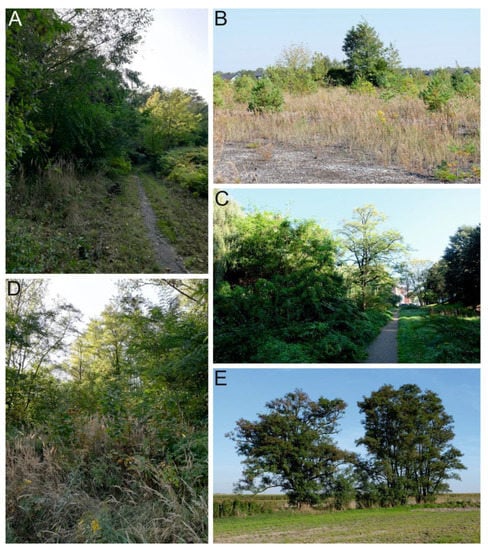 The fifth sampling site is located about 15 km north of Gliwice city, near Zawada village (Figure 1E and Figure 2E). The samples were collected from an unprotected area of arable land, where due to human activity, vegetation is significantly transformed and differs from the original systems. Agrocenoses rich in ubiquitous species predominate. Vegetation is presented as a mosaic of natural, semi-natural, and anthropogenic communities. The samples were collected from an R. pseudoacacia bush growing on the edge of farmland.