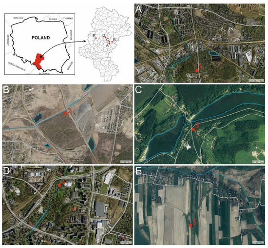 Location of Silesia on the background of the Polish contour map and localization of the sampling sites in the contour map of the Silesia: (A–E) satellite photos of the sampling sites. Red dot—sampling site; blue dotted line—watercourses; blue line—water reservoirs; yellow dotted line—railroads; grey lines—larger access roads.
