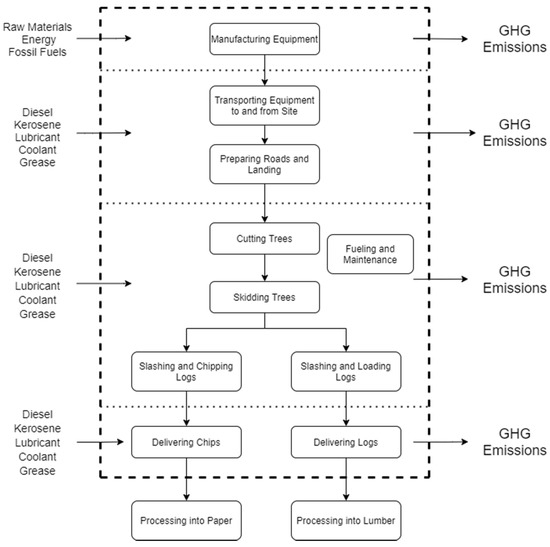The scope of this LCA was cradle-to-gate, including all processes involved from resource extraction up to the first gate when raw materials are delivered to their markets, but excluding the production, use, transportation, and end-of-life stages of the product life cycle. The exact activities included are represented by the System Diagram in Figure 1, but consist of all processes to cut, skid, and land trees, along with necessary auxiliary processes such as equipment manufacturing, equipment staging, road preparation, and maintenance. The dashed line represents the system boundaries, dotted lines represent subsystem boundaries which may be useful in interpreting the impact, and the arrows in and out of the system represent the physical flows that were observed. The selected functional unit, the unit to which the absolute emissions are scaled, is 1 Mg of green clean chips and 1 Mg of green sawtimber.