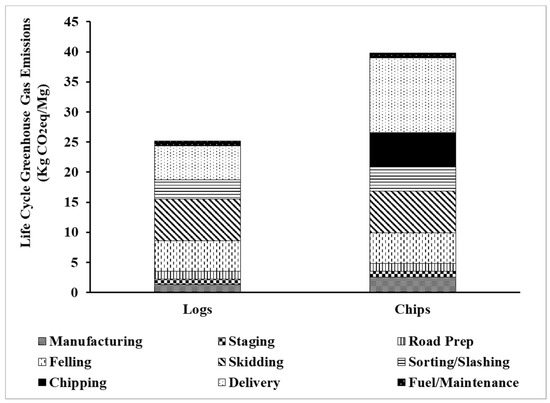 To have a more direct comparison between clean chips and logs, we recalculated the impact if the transportation distance to their respective markets were equivalent. When both mills are equidistant from the landing (71 km), the emissions from harvesting and delivery of clean chips were reduced to 34.4 kg /Mg (Supplementary Materials, Figure S2). Therefore, harvesting and delivering wood chips result in higher GHG emissions per unit of mass than sawtimber when the impacts of the shared processes were allocated by mass. It should be noted that a different allocation approach (e.g., economic value) may lead to different conclusion. However, the ISO standard recommends use of the economic allocation approach when it is not possible to use physical relationship (e.g., mass, volume, or energy).