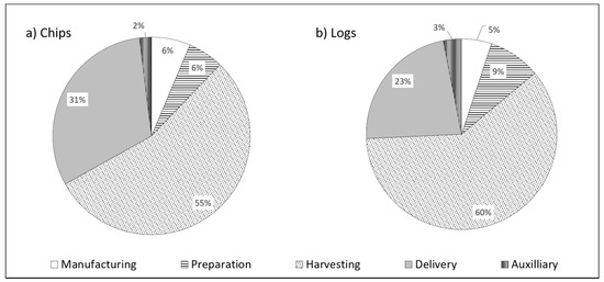 Contribution of different stages to the life cycle greenhouse gas (GHG) emissions for (a) wood chips production and (b) logs production.