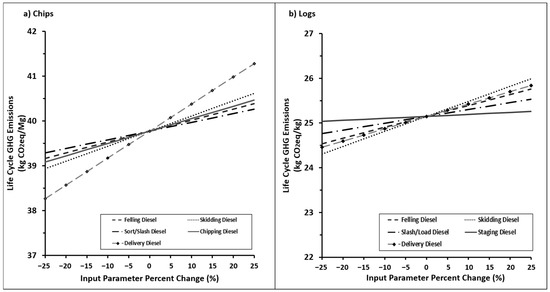 The sensitivity analysis demonstrated that the amounts of diesel and kerosene consumed by the equipment are the most influential parameters affecting the life cycle GHG emissions of the harvest system (Figure 4, see Tables S3 and S4 in the Supplemental Materials for the complete list of parameters). This may be unsurprising because both forest harvesting and delivery of wood products strongly depend on the consumption of fuels, representing 86% and 83% of the total impacts associated with wood chips and logs, respectively (Figure 3). For logs, diesel fuel consumed during equipment staging lead to a change of ±0.43% of our baseline estimate for a 25% change in parameter value. For chips, fuel consumed during sorting and slashing changed the baseline estimate by ±1.2% for a 25% change in parameter. All other materials consumed for these activities, and all parameters of the activities not presented, influence the total impact for either product by less than these respective values. The machine life hours were the only parameters to have an inverse relationship with impact, although the system was still less sensitive to changes in their values than for changes in staging diesel for logs or sorting and slashing diesel for chips.