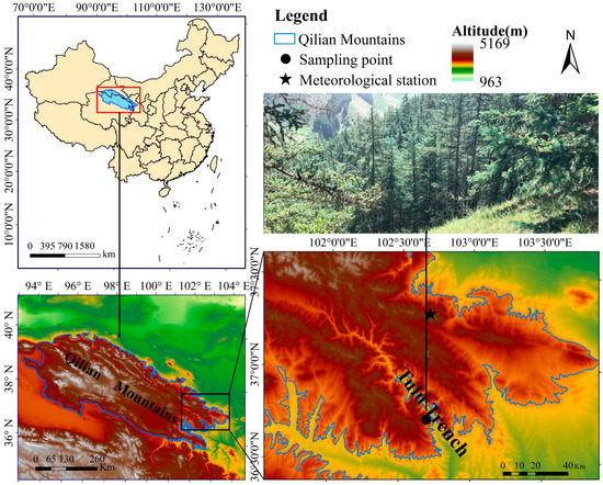 The study area was in Tulu Trench Forest Park (36°40′–36°44′ N, 102°36′–102°45′ E) in the eastern Qilian Mountains (Figure 1). It has a typical temperate continental monsoon climate, with rainy and hot periods (Figure 2). The Wushaoling meteorological station (37.2° N, 102.87° E; 3045.1 m), which is close to the sampling point, was selected for meteorological data. The mean annual precipitation was 414.8 mm from 1960 to 2018, and more than 60% of that occurred in June–September. The mean monthly temperature ranges from −11.8 °C in January to 11.6 °C in July. The annual total solar radiation is 469 kJ/cm2, the frost-free period is only one-third of the year, and the annual evaporation is much greater than the annual precipitation. The study area is rich in vegetation resources and presents obvious vertical zoning, transitioning from low-altitude forests to high-altitude meadows; trees mainly include coniferous species, such as Qilian Qinghai spruce, P tabulaeformis, juniper, and Picea wilsorii, as well as Populus davidiana and Betula albosinensis. In addition, Betula platyphylla and other broad-leaved trees are present, and shrubs, such as Cotoneaster, Rhododendron and Potentilla, and herbaceous plants, such as Kobresia pygmaea, are also abundant [42].