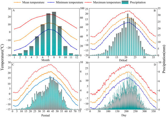 SThe daily data were used to calculate the pentad, dekad, and monthly climatic values. We first generated the daily average of each climatic factor from 1960 to 2018 (Figure 2D). The total precipitation and mean temperature of 28 and 29 February in the leap year were used as precipitation and temperature of 28 February. There are 73 pentads in a year. For example, the first pentad is 1–5 January, and the 73rd pentad is 27–31 December [45]. The pentad precipitation is the total precipitation over a 5-day period, and the temperature is the mean temperature of those 5 days (Figure 2C). There are three dekads in a month and 36 dekads in a year. The first dekad of a month extends from the first to the tenth day of the month; the following 10 days are the second dekad; and the 21st to the last day of the month is the third dekad. Similar to the pentad, the dekad precipitation is the sum of the daily precipitation, and the temperature is the mean temperature of the 10 days (Figure 2B).