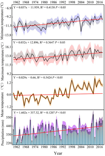 Interannual variations of temperature and precipitation in the study area from 1960 to 2018 (blue, red, and orange, and purple, respectively, indicate the inter-annual variation error range of temperature and precipitation).