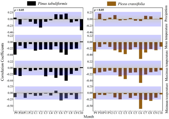 The radial growth of P tabulaeformis was significantly positively correlated with the precipitation in the current growing season and negatively correlated with the temperature (average temperature, maximum temperature, minimum temperature) mainly in the current growing season and at the end of the previous growing season. P. crassifolia also had a similar response pattern (Figure 6).