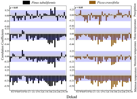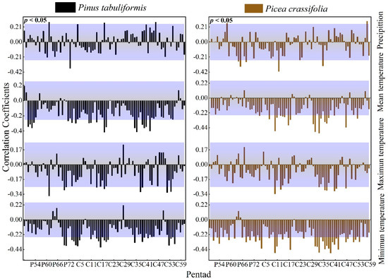 The radial growth of the two dominant tree species in the study area showed similar correlations in daily climatic factors, dekad and pentad scales, mainly showing a positive correlation between precipitation in the growing season and a negative correlation between temperature in the first and middle of the growing season (Figure 7).