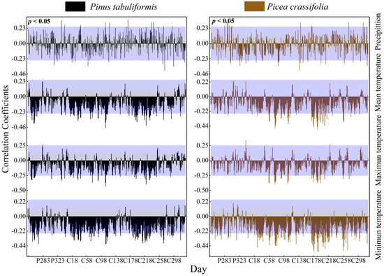 Response of the radial growth of trees to daily values of climatic factors (Beyond the top of the purple shade, p values are positively correlated (p < 0.05), lower than the part in purple shadow indicates that p values are negatively correlated (p < 0.05).