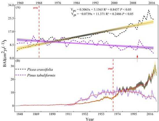 This study found that temperature is one in all the key factors limiting the radial growth of trees within the study area, which increased significantly at 0.428 °C/10a (Figure 3). However, different growth trends were observed in the two species (Figure 8). We saw an upward trend in the BAI of P. crassifolia from 1960 to 2018 (3.065 cm2 yr−1/10a/10a), while this factor increased first and then decreased for P. tabuliformis. Notably, the growth rate of P. tabuliformis has decreased significantly (−0.739 cm2 yr−1/10a) since the middle of the 20th century, given the significant increase in temperature.