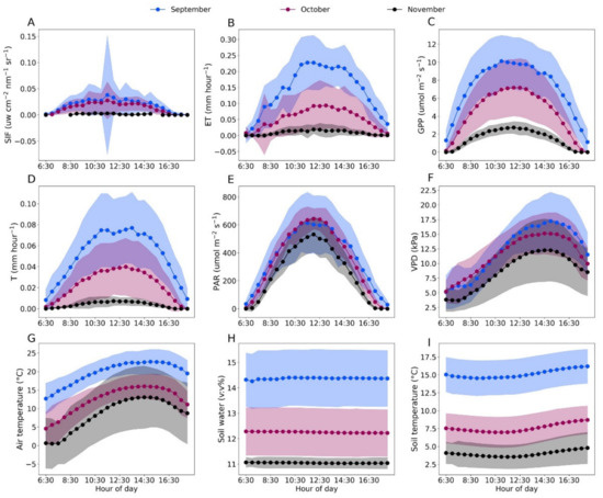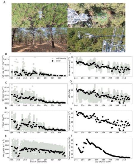 - Damm, A.; Haghighi, E.; Paul-Limoges, E.; van der Tol, C. On the seasonal relation of sun-induced chlorophyll fluorescence and transpiration in a temperate mixed forest. Agric. For. Meteorol. 2021, 304–305, 108386. [Google Scholar] [CrossRef]
