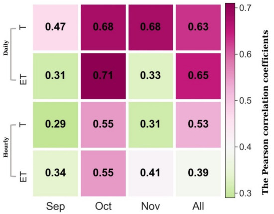 3.2. Correlations between SIF and T at Hourly and Daily Timescales