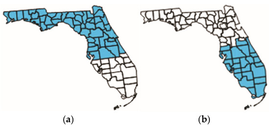 Planting regions in Florida for E. amplifolia (a) and C. torelliana (b) from [5].