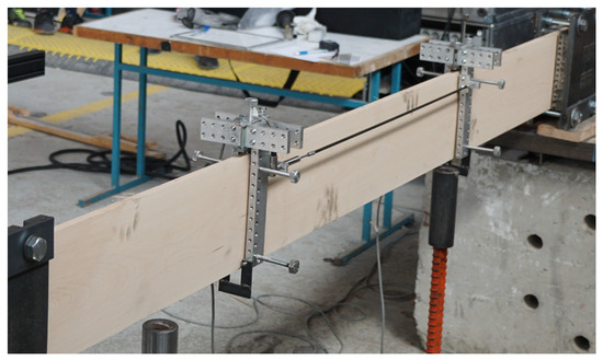 Tension tests were done in accordance with the EN 408 [17]. The specimens were loaded in tension with a clamping system with 1 m long serrated clamps. The load rate was controlled by displacement. A load cell measured the force in the dynamic piston. The displacements were measured with an LVDT (linear variable differential transformer) system placed diagonally on both sides of the boards in the middle between the clamps. The WA 20 mm LVDTs from the company HBM were used as is shown in Figure 1. The length of the LVDT measurements was five times the width of the boards. To obtain a more accurate measurement, three load cycles were performed to 40% of the expected maximal force, and the displacement on each cycle was measured. This approach proved to be correct since most of the time, the first cycle showed different stiffness than the later two, which were very similar. The third cycle was used for the calculation of the static MOE.