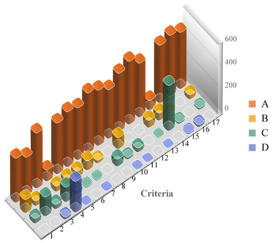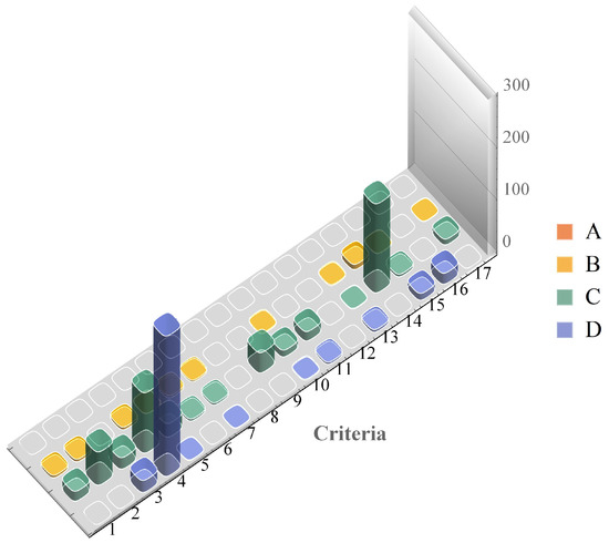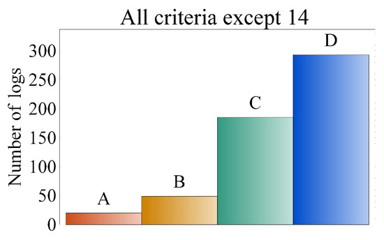 The cases when a criterion was the determining factor are displayed in Figure 7, together with the class the log was assigned to. From this figure, it is even clearer that the most influential criteria for this sample were 2, 3, 4, 9, and 14.