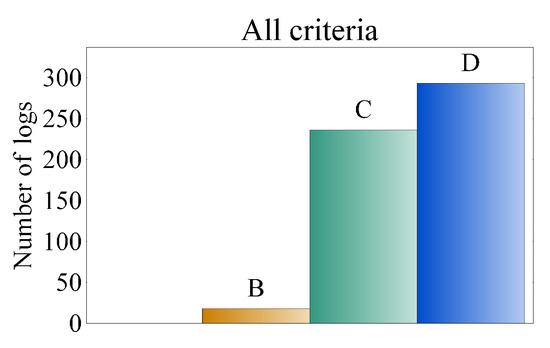 As there is a debate if red heart (14) is really important since it has not been shown to have a strong influence on strength [18,19] and is therefore more or less a visual preference, two overall gradings were considered, with (Figure 3) and without (Figure 4) the inclusion of the red heart criteria. As can be seen, the only real difference is in the number of logs allocated to class C, since the standard allows red heart in both C and D classes.