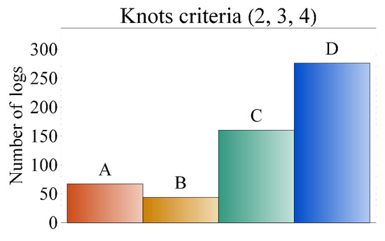 To see what happens when only grading based on the most influential criteria (2, 4, 9, and 14), Figure 5 was created, which is similar to the results in Figure 3, meaning that for our data, the log grading could be based on only these four criteria. The influence of knot criteria (2, 3, and 4) was also considered; therefore, the logs were graded based only on these three criteria as can be seen in Figure 6. The results are similar to those of Figure 4.