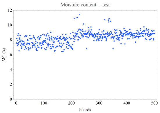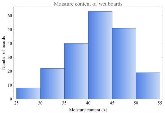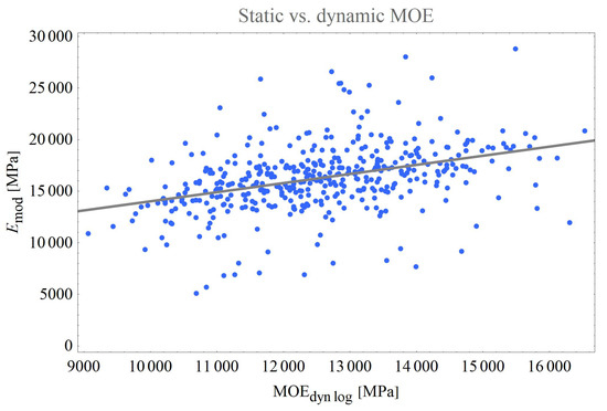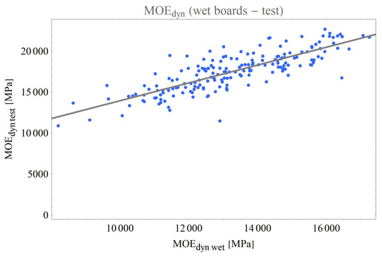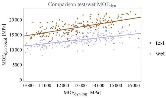 The coefficient of determination of the dynamic log MOE compared to the dynamic MOE of wet boards was . In comparison, Rais et al. [10] obtained a value of , which is very similar.