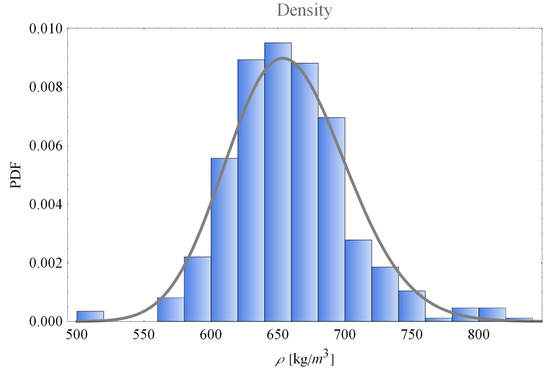 As is written in the European standards EN 338 [20] and EN 384 [21], the average moisture content “at a temperature of 20 C and a relative humidity 65% corresponds to a moisture content of 12% for most species”. Since this research is focused on beech, which is not the most common species to be used in construction, and since the mean moisture of dried boards at the time of testing for both batches was 8.3%, which is similar to the 8% ± 2% that Ehrhart et al. reported in 2018 [22], a small batch of 49 random pieces was placed in an acclimatized chamber holding standard service class 1 conditions of 20 C and 65% relative humidity. The specimens were left in the chamber and checked every 24 h until the differences between the masses of each and every one of the specimens were less than 0.1%. The mean equilibrium moisture content of the specimens was 10.5%, with a standard deviation of 0.21%, a minimum value of 10.0%, and a maximum value of 10.9%. The resulting moisture equilibrium values are similar to the values of 10.6% reported by Rais et al. [10].