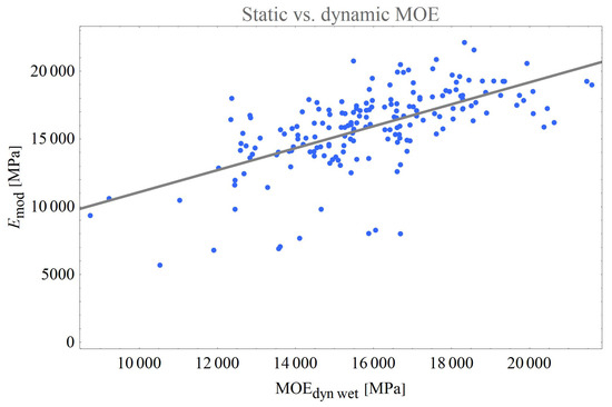 In Figure 17, the comparison between the static MOE of dried boards and the dynamic MOE measured on wet boards can be seen. The coefficient of determination was = 0.38. The ANOVA statistical test revealed that the linear model is statistically significant with a p-value lower than 10. As can be seen in Figure 16 and Figure 17, there were some outlier boards with fairly low static MOE values, which have a considerable negative influence on the coefficient of determination. By eliminating these eight obvious outliers, the coefficients of determination increased to and , respectively. The ANOVA statistical test in both cases revealed that the linear model is statistically significant with a p-value lower than 10.