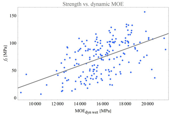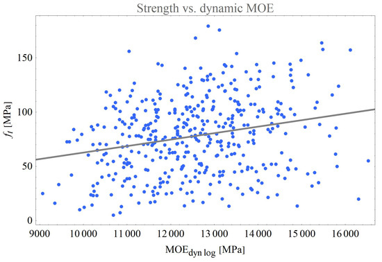 The coefficient of determination of the tensile strength compared to the dynamic log MOE was . Hanhijärvi et al. [8,9] reported the value of for the static tensile MOE of Norway spruce, between and for the bending MOE of Norway spruce, and between and for the bending MOE of European red pine. These are similar results to the ones with the static MOE, but all are slightly lower. If the dynamic MOE measurements of wet boards are used instead of logs, the coefficient goes up to .