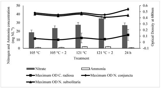 Meanwhile, the highest growth was detected for N. subsolitaria when the species was cultured in the AHFR SE media for 24 h. The highest concentrations of ammonia and nitrate are detected in the application of the 121 °C twice extraction method, achieving a concentration of 2 mg NL−1 and 2.85 mg NL−1 for ammonia and nitrate, respectively.