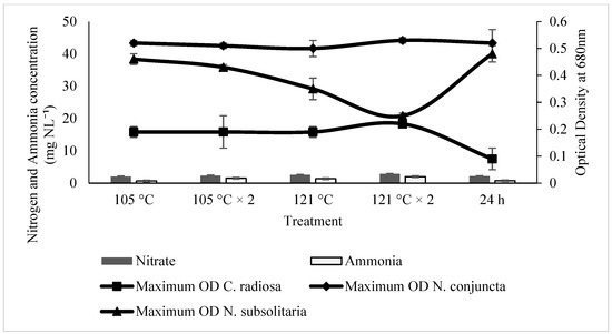 Inorganic N, such as nitrate or ammonium ion, is a notable limiting nutrient in microalgal growth. Figure 1 shows the results of the three microalgal species used in this study: C. radiosa, N. conjuncta, and N. subsolitaria. A positive growth effect is observed in all three species by the recovered ammonia and nitrate from the RMFR and AHFR samples. The highest growth is observed in C. radiosa and N. conjuncta cultured in RMFR SE media for 24 h. Meanwhile, the highest growth for N. subsolitaria is detected in the RMFR SE media with 105 °C and 121 °C. Meanwhile, the highest concentrations of ammonia and nitrate are detected when the extraction method of 121 °C twice is employed, with a concentration of 2 mg NL−1 and 35 mg NL−1 for ammonia and nitrate. Similar growth is observed in all three microalgae in modified SEs of AHFR (Figure 2), where the highest growth is observed in C. radiosa and N. conjuncta cultured in AHFR soil media with 121 °C twice.