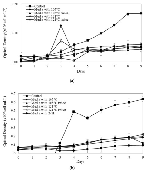 Table 3 shows the different maximum OD values for the three microalgal species for the control and SE that has been modified. Maximum OD of C. radiosa is observed in the control experiment, followed by the media with 24 h and media with 121 °C twice in RMFR and AHFR SE. N. conjuncta exhibits the maximum OD in the control media and media with 24 h for RMFR SE and in media with 121 °C twice, media with 105 °C, and media with 24 h for AHFR SE. Meanwhile, N. subsolitaria exhibits a higher OD in the RMFR SE control experiment, followed by the media with 105 °C and media with 121 °C, while the highest OD for AHFR SE recorded in the media with 24 h.