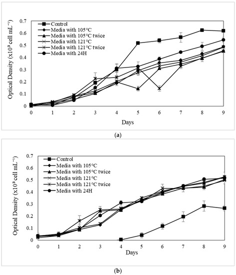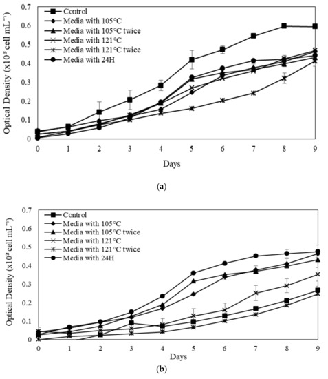 The maximum OD observed in Ayer Hitam SE is higher than that of Raja Musa SE at different treatment methods for all microalgal species. Maximum OD at specific points has been observed specifically in N. conjuncta and N. subsolitaria when treated with Ayer Hitam SE. Several studies have reported using soil extracts for algae cultivation and growth enhancement [71,72]. Moreover, the production of microalgae biomass was reported to increase significantly due to its higher levels of N, P, and higher concentrations of micronutrients (Co, Mn, Zn, and Cu), which adversely affect the growth of microalgae, as studied by Lian et al. [73]. In the present study, media with 121 °C, × 2 and 24 h of treatment method exhibited the maximum OD in Ayer Hitam SE in modified soil extracts. Marjakangas et al. [74] stated that autoclaving at high temperatures for an extended time could kill bacteria and protozoa; thus, inhibiting the growth of microalgae. Moreover, a drastic increase in dissolved organic matters after autoclaving has been reported [70,75,76].