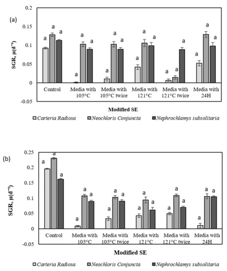 In the modified RMFR and AHFR SEs, the SGR (μ) value of three microalgae depends on various medium types used. The highest SGR (0.129 d−1) is observed at the modified RMFR SE in media with 24 h for N. conjuncta (Figure 6a). N. conjuncta displays the highest SGR in the control media at 0.23 d−1 among the three microalgae cultivated in modified AHFR SE (Figure 6b). Nevertheless, in the modified RMFR SE and AHFR SE, the three microalgae division rates (k) depend on the microalgae SGR (Table 4). N. conjuncta exhibits the division rate of 0.18 d−1, the highest in media with 24 h treatment of RMFR SE. Moreover, N. conjuncta also recorded the highest division rate in AHFR SE treatments, with 0.16 in media with 105 °C and 121 °C twice treatments.