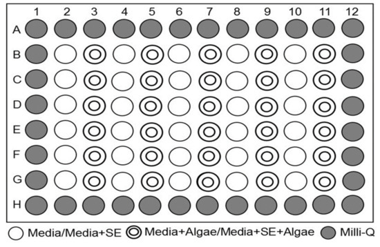 Figure 7 shows the setup of the microplate. The microplate was divided into three main zones, i.e., the outer wells (the buffer zone, red-marked) filled with 200 µL of Milli-Q water to minimise evaporation and maintain the humidity of the microplate. This zone prevents the wells containing samples from drying during the nine-day incubation period. The second zone comprised wells filled with control samples and placed alternatively between wells that contained microalgae. The 195 μL media and 5 μL SE (marked white) were filled with these wells as control. The well of the third area included 175 μL media, 5 μL of SE, and 20 μL of microalgae. Each sample was replicated three times. The average optical density (OD) of the corresponding samples were determined every 24 h for 9 days at the condition of 25 °C, a light intensity of 2500 lux with a 12:12 light-dark cycle. Once the microplate well was filled up, it was covered and sealed with parafilm to prevent contamination and evaporation. Each microplate contained two types of microalgae denoted as B2, C2, D2–B11, C11, and D11 for the upper part and E2, F2, G2–E11, F11, and G1 for the lower part.
